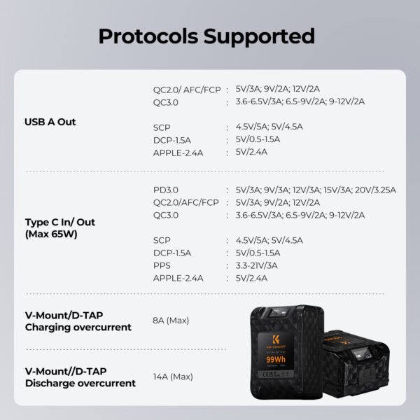 * Multiple Interfaces. This V-Mount battery with USB-C, USB-A, BP and D-TAP ports is more versatile and supports powering multiple devices at the same time, such as DSLR cameras, camcorders, monitors, smartphones, wireless video transmitters, tablets and laptops.